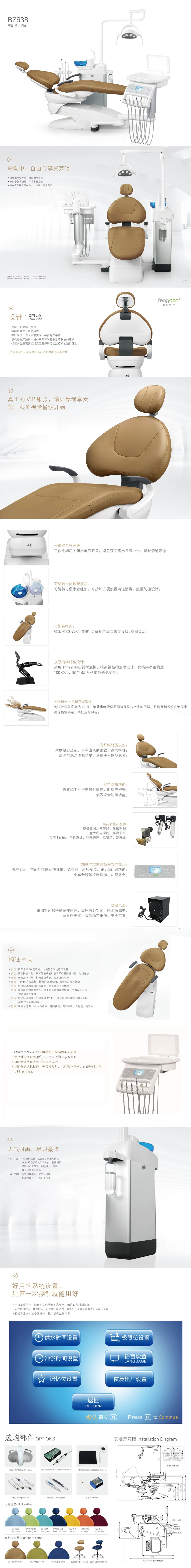 BZ638灵动款灵动作为枫丹BZ系列最高端的机型,铝合金外壳设计机箱,豪华治疗椅,独特的侧出臂结构设计,搭配彩屏牙椅设置系统,是您打造高端诊室的最佳选择